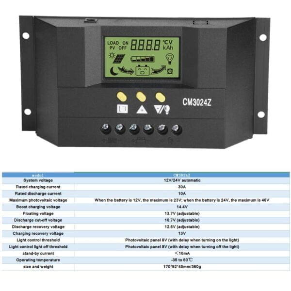 CM3024Z PWM Intelligent Solar Charge Controller 12V 24V PWM 30A LCD dual USB 5V Mobile Charger Solar Panel Battery Charge Controller Regulator 30 Amps protected against insertion of fingers and will not be damaged or become unsafe during a specified test in which it is exposed to vertically or nearly vertically dripping water. 12/24V battery automatic detect. PWM charging available, 3-stage charging algorithm: impulse, bulk and float. Reverse battery pole connection protection, LED display shows system status at all times.